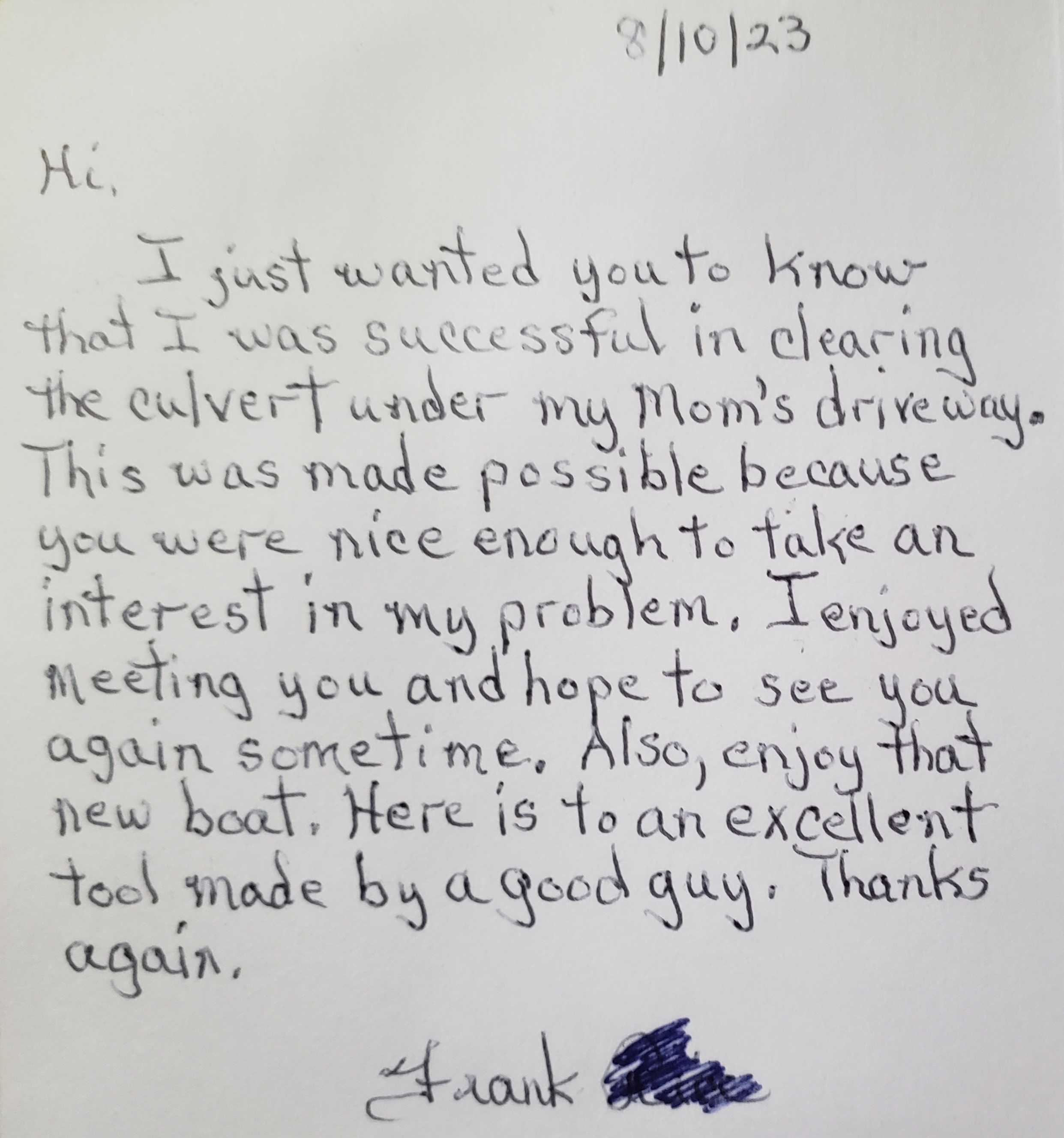The culvert cleaning tool arrived today! My husband is very pleased with the tool. He said you are a genius! The tool works as promised and is amazing!